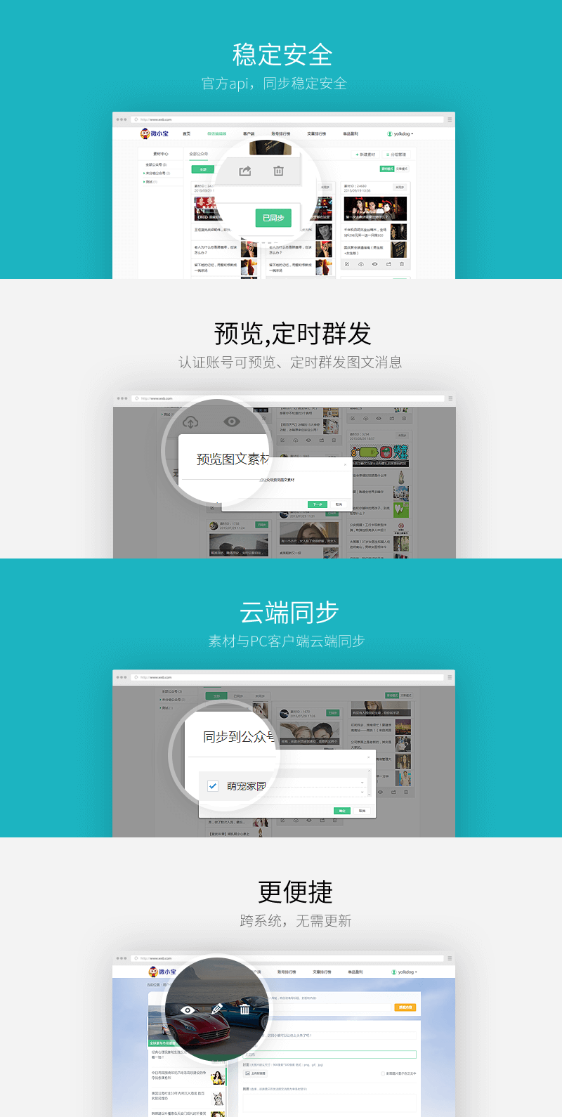 - 多账号素材同步:图文素材可同步到多个公众号,无需认证,快速稳定,微信运营团队必备!